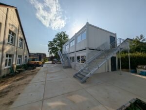 Hasbergen, Germany – A modern two-story school constructed entirely from 8 modular units, with a total area of approximately 145 m², fully realized by Amiri Group.